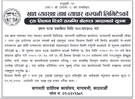 ट्रक लिलाम बिक्रि सम्बन्धि बोलपत्र आह्वानको सूचना