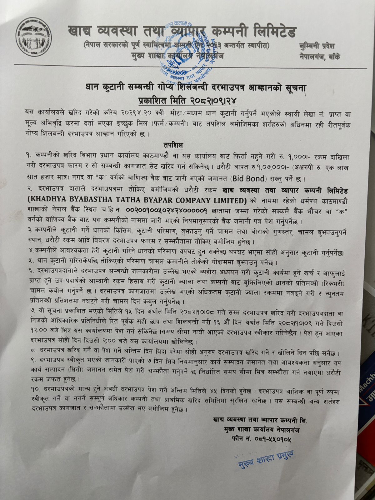 धान कुटनी सम्बन्धि गोप्य सिलबन्दी बोलपत्र आह्वानको सूचना(नेपालगन्ज)