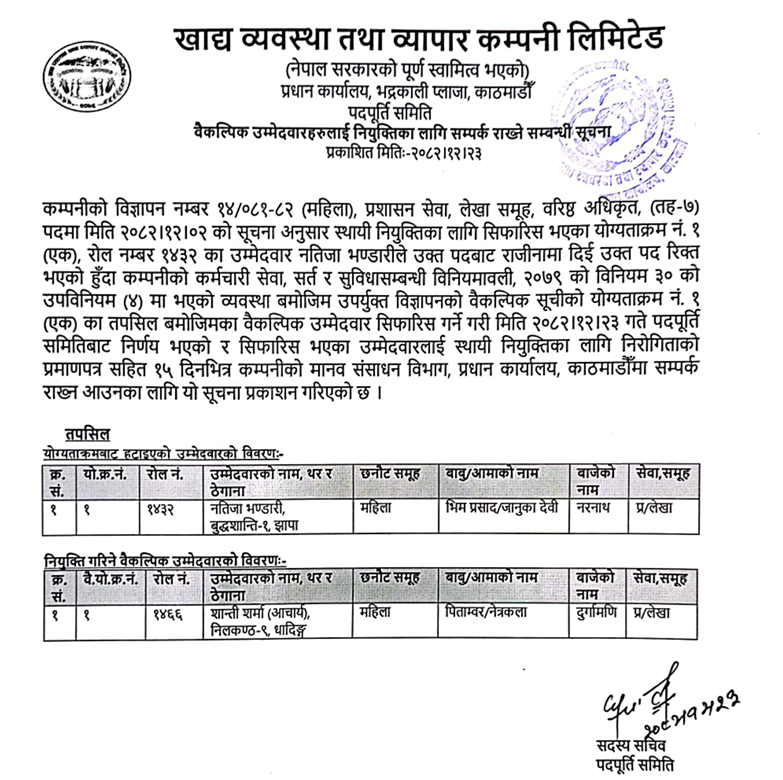 बैकल्पिक उम्मेदबारलाई नियुक्ति लिन आउने सम्बन्धि सूचना