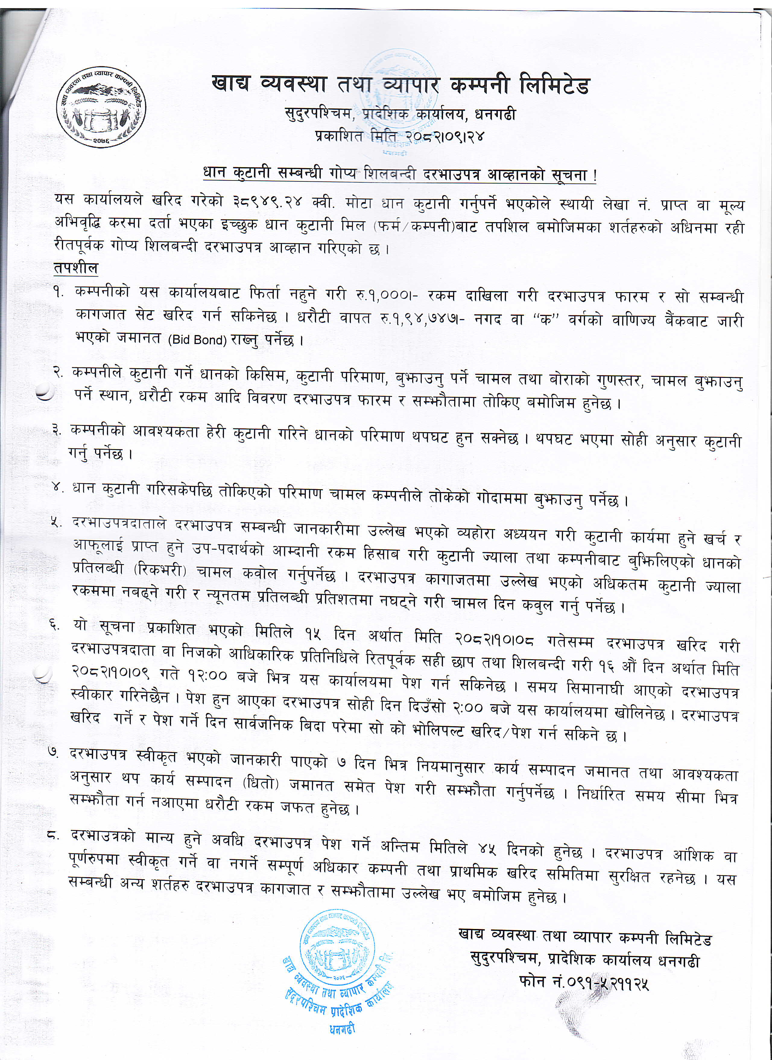 धान कुटनी सम्बन्धि गोप्य सिलबन्दी बोलपत्र आह्वानको सूचना(धनगढी) (२०८२-०९-३०)
