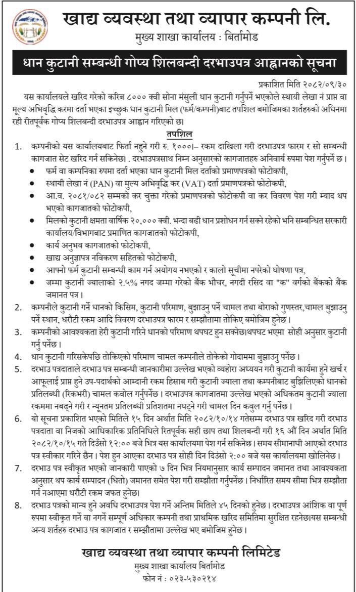 धान कुटनी सम्बन्धि गोप्य सिलबन्दी बोलपत्र आह्वानको सूचना(बिर्तामोड) (२०८२-०९-३०)