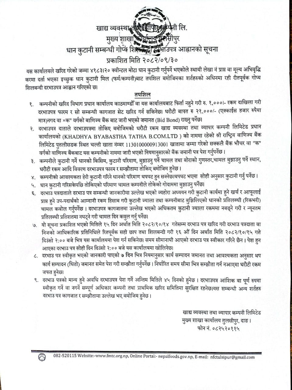 धान कुटनी सम्बन्धि गोप्य सिलबन्दी बोलपत्र आह्वानको सूचना(तुल्सीपुर) (२०८२-०९-३०)